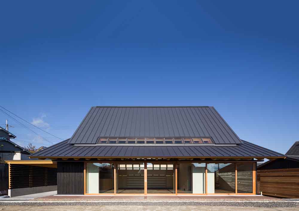 この住宅は、奈良市の西、昭和30-40年代に開発された比較的区画の大きな住宅地に位置する。クライアントの家族構成は夫婦と子供一人、犬一匹である。クライアントからは、諸室など具体的要望に加え、今日的でありながら、どこかに日本的なものを感じさせる住居が求められた。議論を重ね、奈良地方の民家に特有の大和棟の形態を引用した大屋根による大空間を住まいの中心にすえることとした。