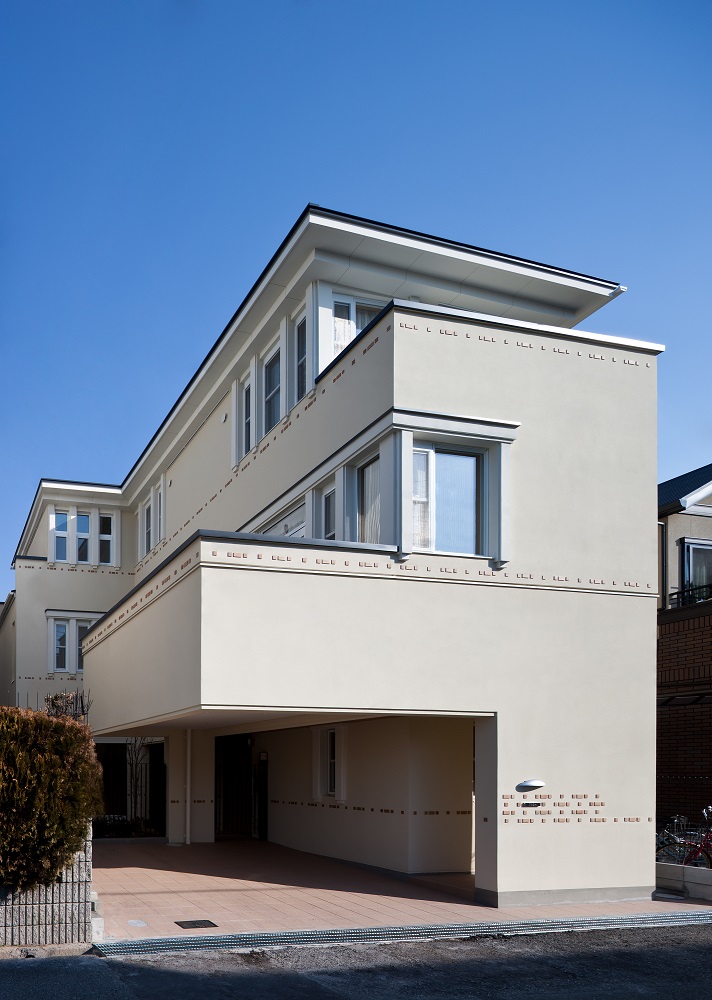 高低差のある敷地形状をそのまま利用し、スキップフロアで各階を繋ぎLDK~書斎を連続した空間として家族が常に気配を感じられる場を中心に配した。インテリアの本棚、ベンチ等の木製の家具においても、また外観の窓周り、門扉、格子、レリーフ等、モダンな手法とは対極にある、どこか懐かしさを感じさせる装飾性も敢えて加味することで、住環境に豊かなテイストを生み出せるよう意図した。