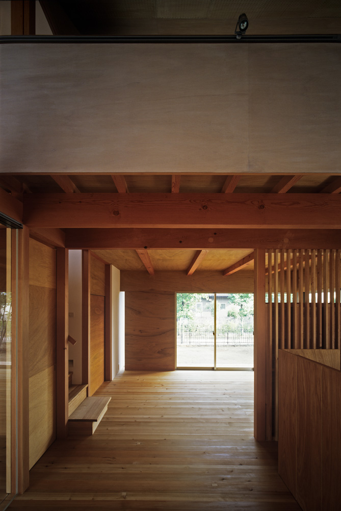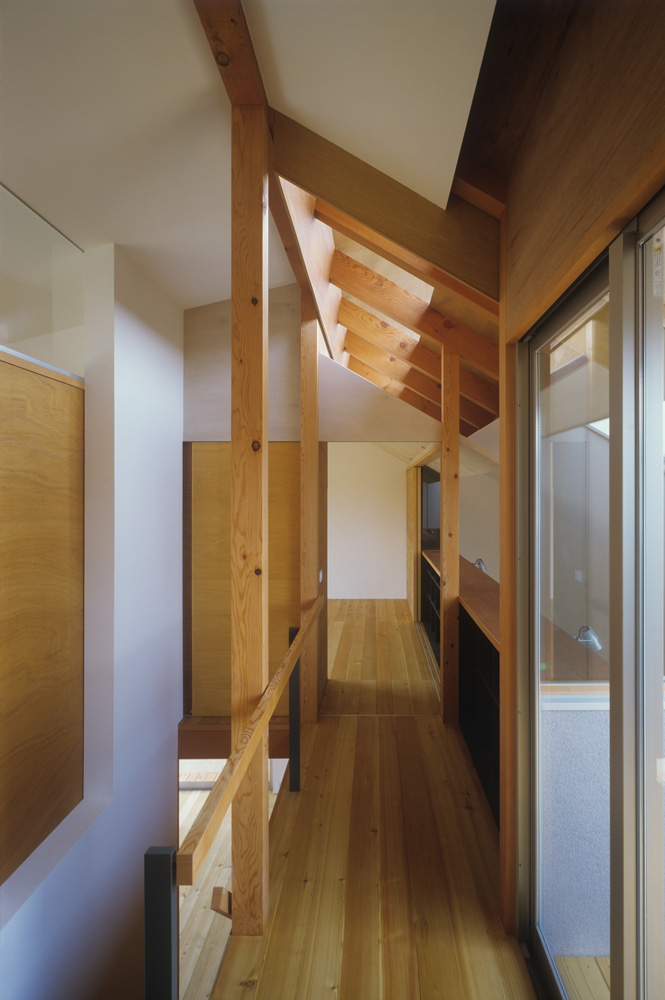 奈良市郊外の高台に建つ住宅である。敷地は南北に細長い角地で、南東は視界が開けていて環境が良い一方、古い石積擁壁があり、高いところで道路との高低差が3m程あった。その擁壁を取り壊して、新たにコンクリートで車庫と擁壁を設けて、圧迫感の少ない米杉の板塀で、居住空間のプライバシーを守るように囲いながら、外部のデッキと大きな開口部で一体的に繋がるようにした。通常はデメリットになる敷地の細長さや道路との高低差が、街との距離感やプライバシーの確保において生かされている。内部は、全長17mという奥行きのあるシンプルな空間に、大きな開口部や小さく絞り込んだトップライト、白い壁面やラワン合板やナラの無垢材、真鍮の手摺、明るさやほの暗さ、広さや狭さといった様々な抑揚がつけられ、穏やかな日常に豊かな風景をつくっている。