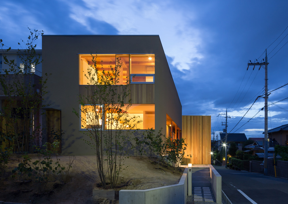 神戸市郊外のニュータウンに建つ住宅である。整然と区画された街並みの一角にあり、南側が歩道付きの幅員の広い道路で、年月を経てアメリカ楓の街路樹が生い茂り、開放的である。北側はアプローチ道路になっており、建物を北側に寄せる事で、南側に大きく庭を取り、人々の往来のある道路からは距離を取ることでプライバシーを確保した。またそれによって隣地の住宅の配置とずれることになり、北側のボリュームは隣地からの影響が少なく、採光や換気がしやすくなった。 南側の居間や2階の居室は開口部を設けて庭に開き、北側はプライバシーを守るように大きな壁面にしている。北側が暗くならないよう設けたハイサイドライトからの光が、時の移ろいを年中感じられるおおらかな空間になっている。
