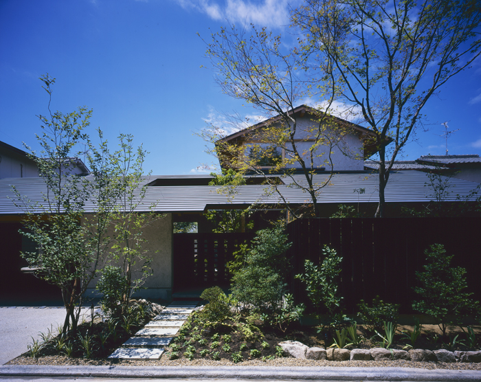 敷地は閑静な住宅地にあり一区画が大きく、敷地の周囲には20年以上経つ高さ6、7m位に育った木々が茂っていた。近くの山への眺望を生かし、2階をパブリックスペースと水まわり、1階をプライベートスペースとしている。1階に個室をとることで、壁量が確保でき構造的にも有利になり、2階の居間、食堂、台所、プレイルーム+ロフトの9.1m×9.1mの大空間を可能とした。大きい空間は障子を引き出すことで、時に応じて4つの室に分けて使うこができる。建物の外壁は全面杉板の鎧貼りとし、道路面の塀は目透かしの縦貼りとした。鎧貼りの外観は人に郷愁を感じさせ、街に落ち着きを与えている。軒先は四周1250mm出すことで夏の高い日差しを遮り、冬の低い日差しを室内まで取り入れ、雨・風・直射日光から木の外壁・木製サッシュを守っている。 春には2階玄関を出ると山桜の花が手に触れるところまで伸びて、初夏には黒い杉塀に白いナニワイバラが咲き、秋にはモミジが紅葉し、冬には薪ストーブに火が灯る。街中で生活していることをひと時忘れさせ、四季の移ろいを感じさせてくれる住まいである。