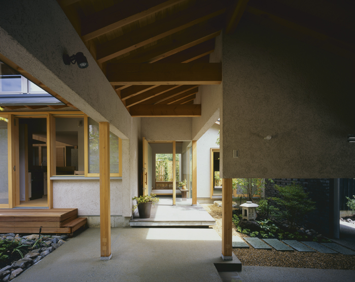 道路に対して建物を平屋とすることで圧迫感をなくして街に対して優しく建つようイメージし、アプローチ空間をそこに生まれた軒下空間に包むことで外部でありながらもプライベート性の高い、街と適度に距離を持った場所となるよう意図した。また、庭を各所に配置して緑を見ながら散歩できるような空間構成とし、吹抜けのある食堂に入ると高窓から障子を通した柔らかい光が差し込み、軒の深いテラスを通して視線が南庭に繋がる変化に富んだ豊かな空間となるよう計画した。生活空間は1階中央の東西に長い2間分のスペースにおさめ、そこから南に一間分のスペースは広い軒下空間である。ここはサンルームやテラス、家事コーナーとして使える付属的な場所であるが、生活空間と明るく広い南の庭との間の余白としてここに在ることで、生活空間を穏やかで豊かな空間へと変化させている。