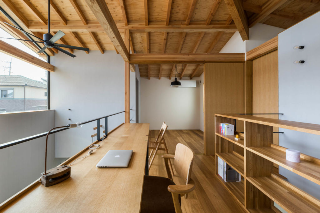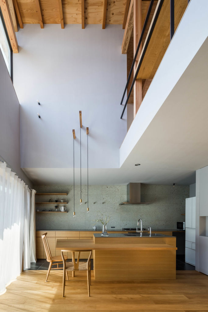8.4mの正方形の対角を軸とした空間は南東に大きく開かれ、それに架けられた大屋根と吹抜をたよりに機能がレイアウトされました。