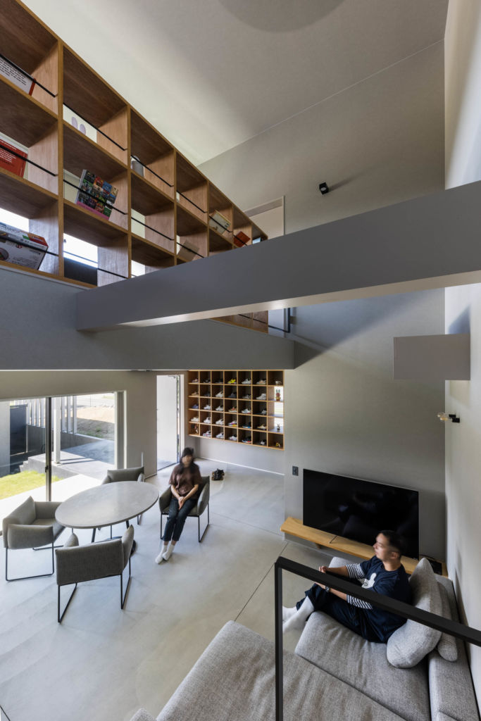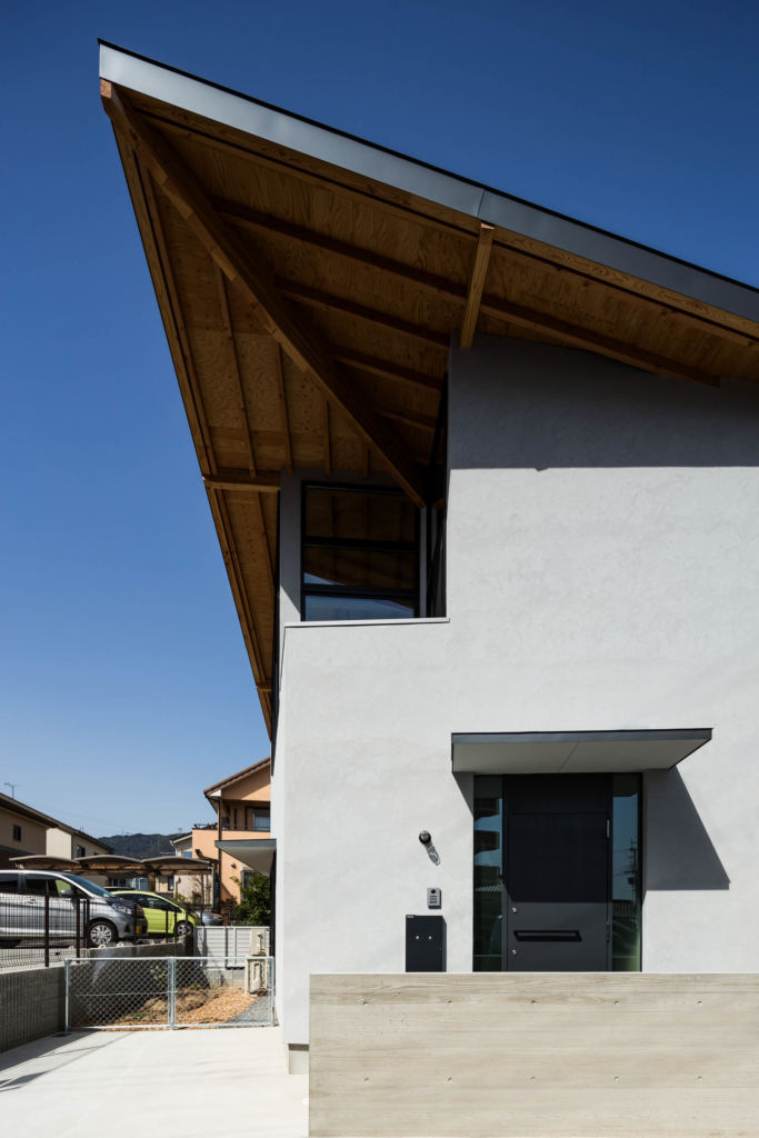大半を占める平屋部の屋根は天井面から35cmの水平スリットによって持ち上げられ軽快な印象を創り出していますが外部側はそれ以外の開口はありません。