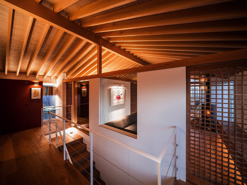 階段を挟んで廃したガラス張りの子供室と一室空間が繋がり、家族がどこにいても気配を感じ、安心感を与える。庭い植えられた緑や、光や風などの自然と、美しい風景を楽しみながら暮らせる住まいである。