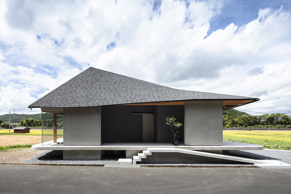 昔から湖の上に建っていたような人工地盤を持つ住まいをつくる。浮遊感のある土間スラブを覆うように、大きな軒下空間の中で内部と外部を一体的に設計した。夫婦と子どもが新たな生活を営む為に必要な水回りや個室を最小限にまとめ、人工地盤の上に少し振りながら配置した。残った余白をリビングや玄関、洗面スペース等、それぞれに適したボリュームとして活用し、用途に適した天井高さを与える。リビングは開放的に、洗面スペース等は最小限の高さとして計画した。この構成により南北に高さを抑えた勾配を持つ屋根と、それぞれを繋ぐことで生まれる東西に捻った屋根を持つ住まいが立ち現れたていった。平屋のようなプロポーションと捻った大きな屋根は、周囲の民家や山並みに呼応する。大きな軒下空間を支える耐震壁を外周にバランスよく配置し、壁と壁の隙間には、周囲の豊かな環境を暮らしに取り入れる事が出来る大きな開口部を設けた。光や風、水の音、四季、風土を感じながら周囲の風景が暮らしに溶け込み、彩りを与える。また、数十年後の近未来では、建て替えを含めた新たな計画が生まれてくるはずである。その際、必ずこの人工地盤は、周囲の環境を含め、無視できない強いコンテクストとして、未来の設計者が歴史を踏まえ計画していくだろう。 山々と田園風景、そして水路として存在するかつての湖と新たなこの建築の関係が時間を超え、はるか太古からそこに佇みながら応答してきた建築として、過去、未来の里山の姿を示していけるのでは無いかと考えた。