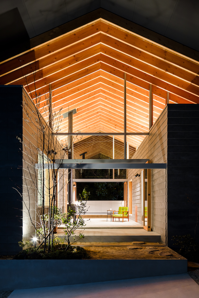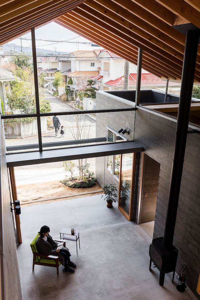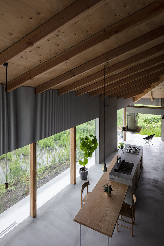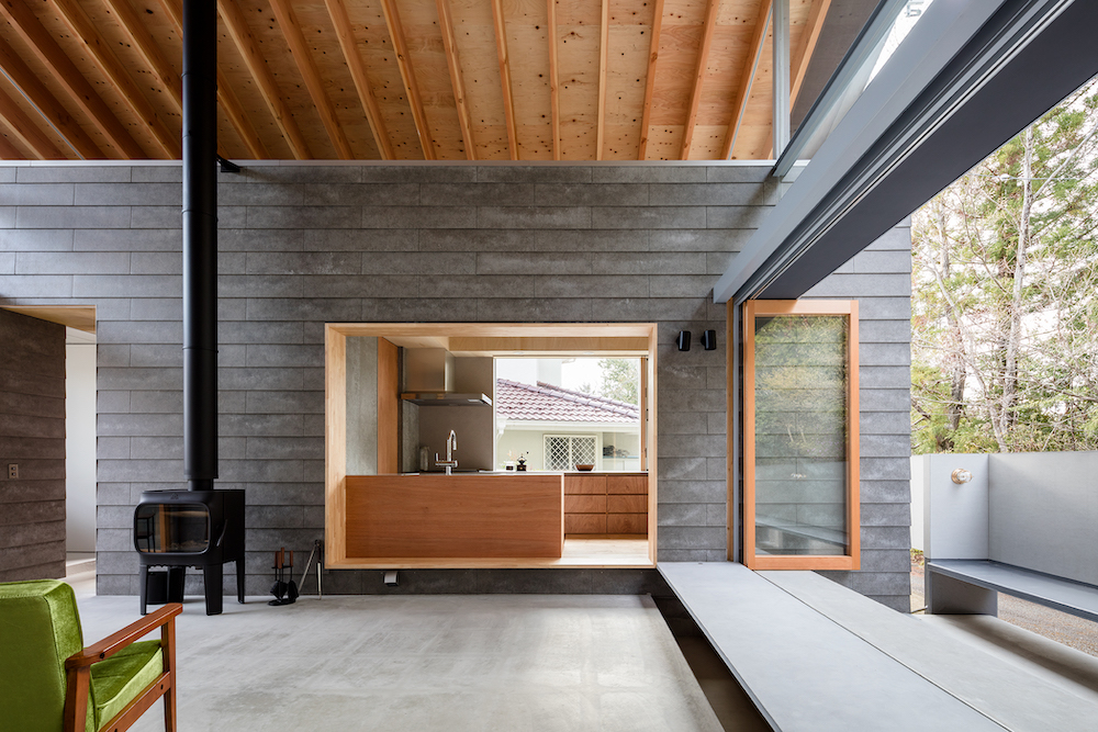 道路側に設けた大きな建具は、自然(山林)と人口(住宅地)を繋ぐ堰として機能する。開け放つことで水が流れ込んでくるように、建物内部に様々な環境が混ざり合う。子供が中、外関係なく走り回り、プールで遊んだり、バーベキューを楽しんだり出来る。またギャラリーや習い事の教室等としても利用出来る空間にもなる。逆に大きな建具を閉めると、人が集い寛ぐリビングとなり、24時間多用な形で利用出来る住まいとなる。この多様な空間を包み込む約9mスパンの大屋根は東端5本+西端5本の合計10本のみの柱で支える木構造とし、空間の自由度を担保した。棟中央、登り梁と桁の接合はホームコネクターを用い、木軸ラーメンのように組み合わせた。また2つのボリュームを3本のH鋼で繋げることでスラスト力を負担しタイバーなどを使わない架構を作り出し、南北の抜けを作り出す浮いたような大屋根を実現した。