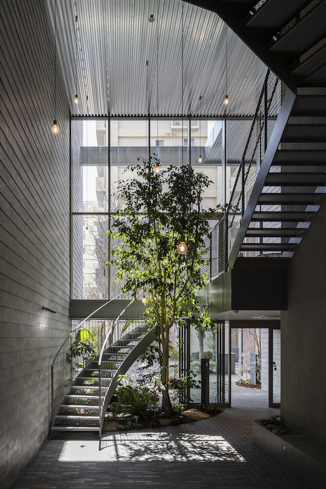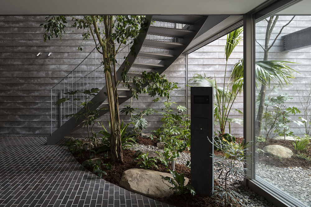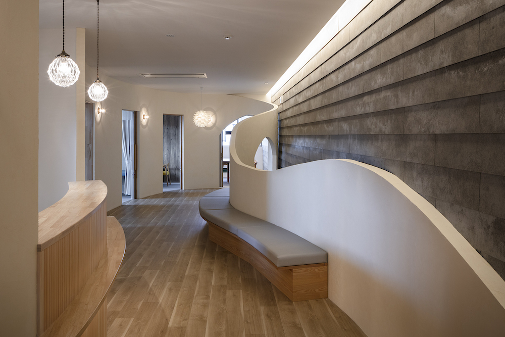 出来る限り様々な人の流れを生み出すため、建物前面には十分な「引き(外部空間)」を確保し、通りを敷地内部まで引き込む配置計画とした。さらに、内部は開放的な空間を生み出すために、4枚のスラブをスキップさせながら縦動線でつなぎ、上下に人の流れと滞留を創り出しながら屋上へと導く空間となる。最上段には格子状のスラブが浮き上がり、この立体空間を「木陰」で包み込んでいる。活動、休憩、待合い、談話など微妙な機能の違いを展開するこの4枚のスラブは、医療施設利用者だけでなく、誰もが自由に使える空間であり、その利用者が立体的に行き来したり、脚を休めたりする様は、まさに呉の街路環境を立体的に纏った建築の様相を表出する。昨今のネット環境の発達や外出自粛の強制などで拍車のかかる身体的なアクティビティの低迷に歯止めをかける環境づくりこそが、これからの「医療」が、単なる治療行為を超えて、人と関わり続ける社会に必要不可欠ではないかと考える。