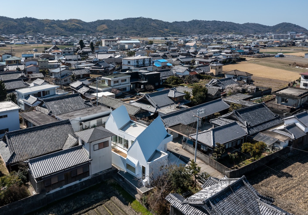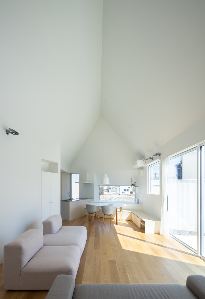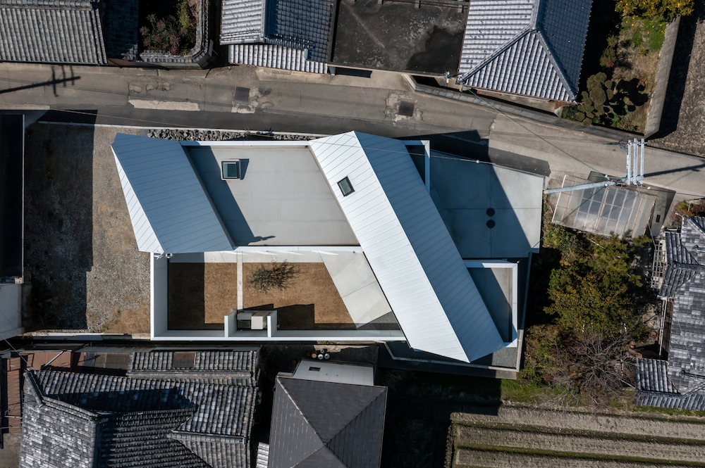 建物は、約56°勾配の切妻屋根が2棟平行に走っている。この2棟の切妻屋根は平面グリッドに対して約26°斜めに回転しており、LDKから敷地北東側の農地への眺望が確保され、敷地北西側には駐車場が確保された。妻部分は平面グリッドの直交ラインによって切り取られた形状となっていて、その結果として生じる複雑な形状の屋根の下には、その形のままの彫刻的な空間が広がっている。