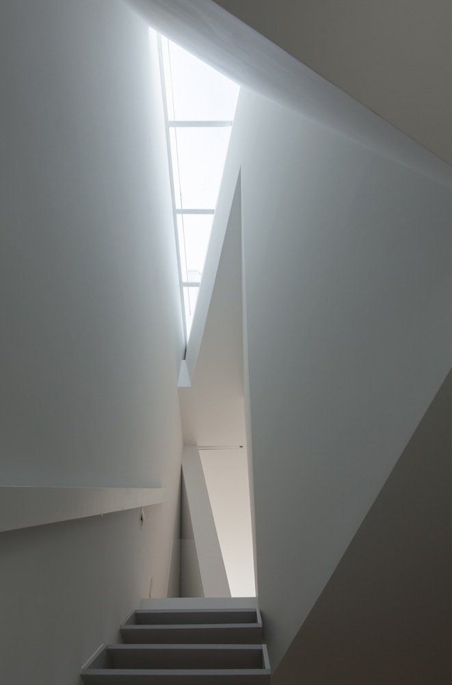 また3階の平面上14°振った2つの壁の内一方は、垂直に対しても傾かせ、階段と重なる部分は折り返され、折り紙やファセット(彫面)の様になっている。この傾いた壁は、「当たり前さ」からの逸脱により人の感覚を自由にし、と同時に、その傾きの触覚や反射する光は新しい身体の感覚を誘発する。