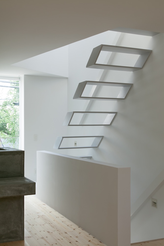 吹抜けには片持ちの箱型階段が浮かんでいる。