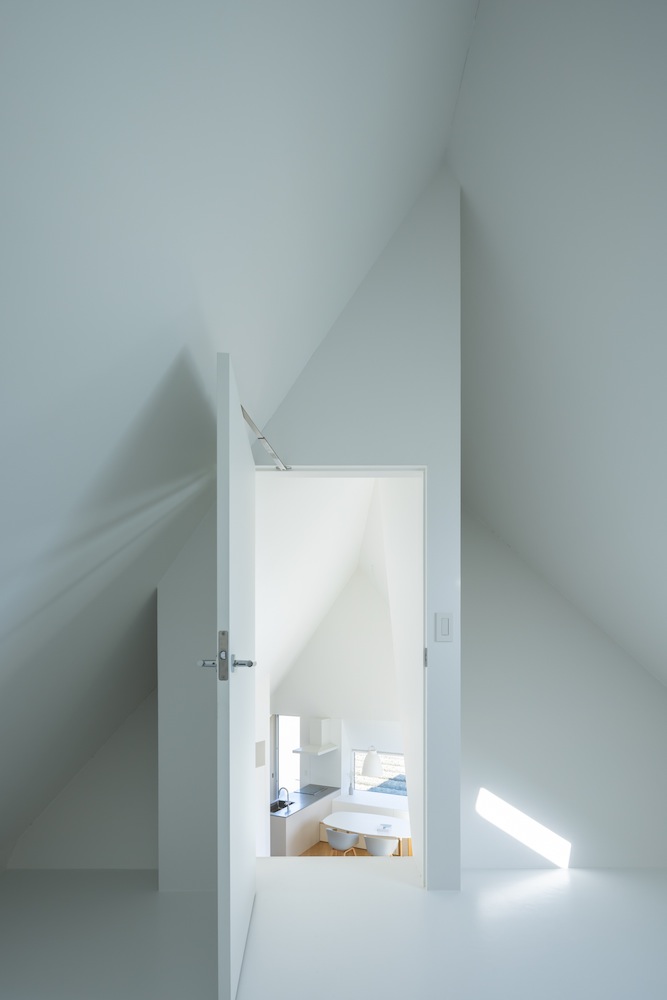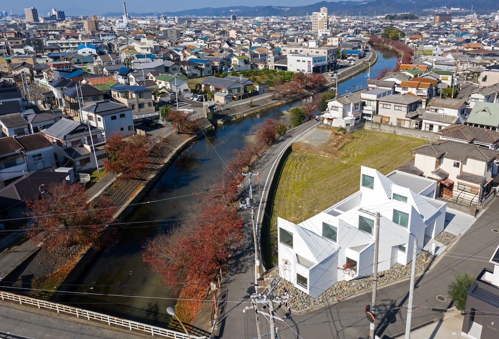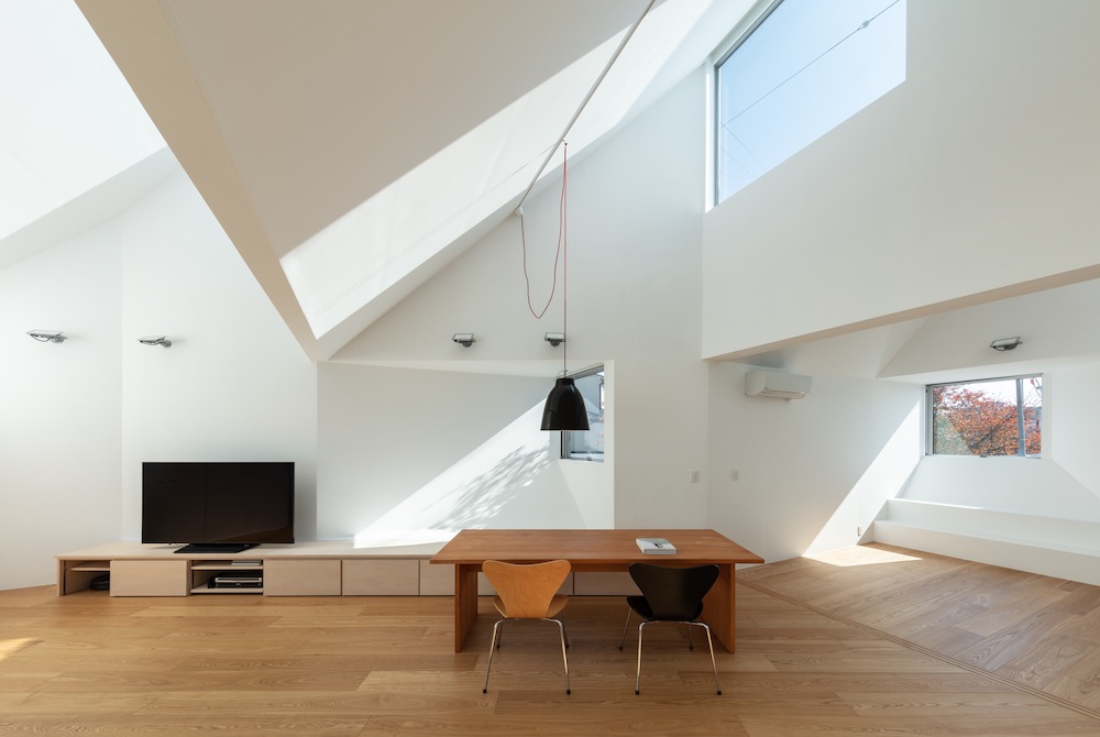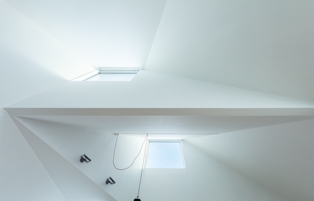 工業建築物を思わせるようなノコギリ屋根のこの住宅は、白い彫刻の様だ。