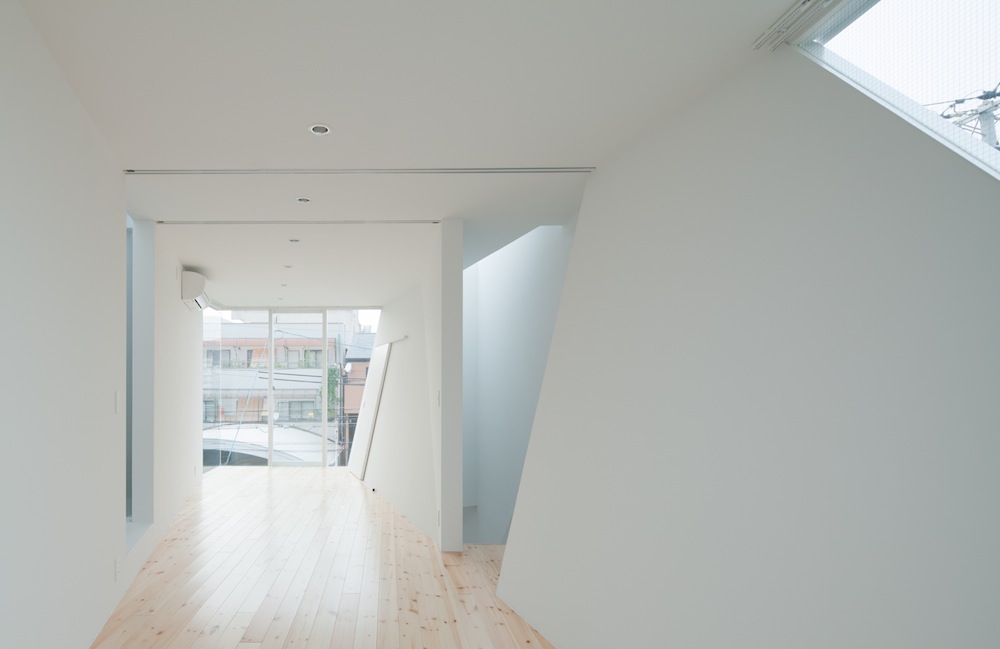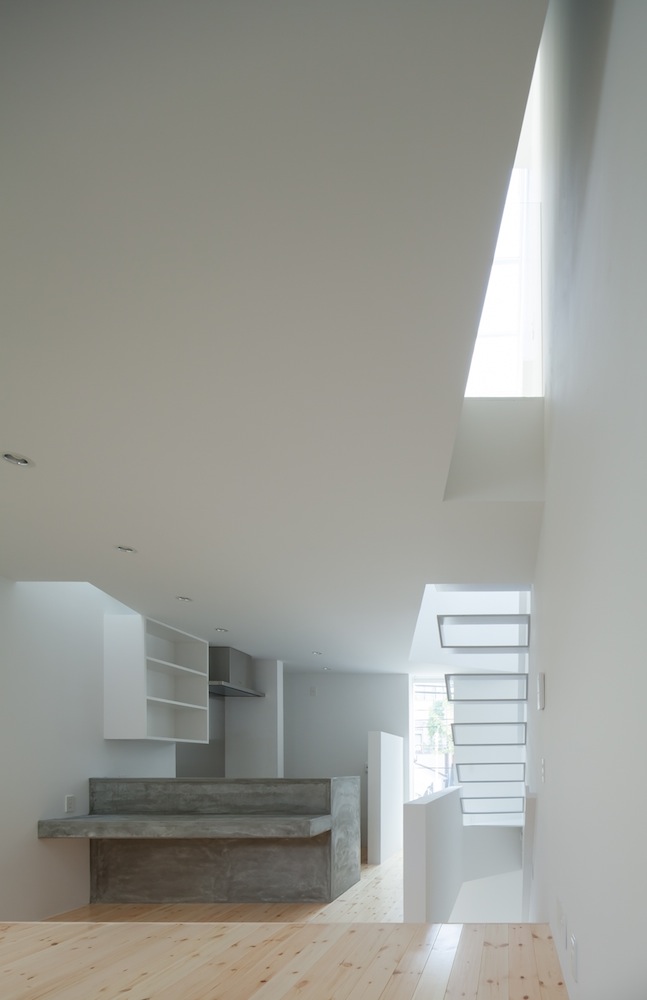 まず、敷地面積が狭いことから、建物のヴォリュームは可能な限り敷地いっぱいとった。建主の生活スタイルから1階には夫婦の寝室・水周りを、2階にはリビング・ダイニング・キッチンを、3階には子供達の部屋を、そして屋上にはルーフテラスを配した。構造上2階の道路側には大きな窓は開けられなかった。そこで3階のヴォリュームを建物の軸に対して14°振り、建物の外壁との間にできる隙間を吹抜けとした。その吹抜けの上部にはトップライトを設け、2階のリビング・ダイニング・キッチンに自然光を落とすことにした。