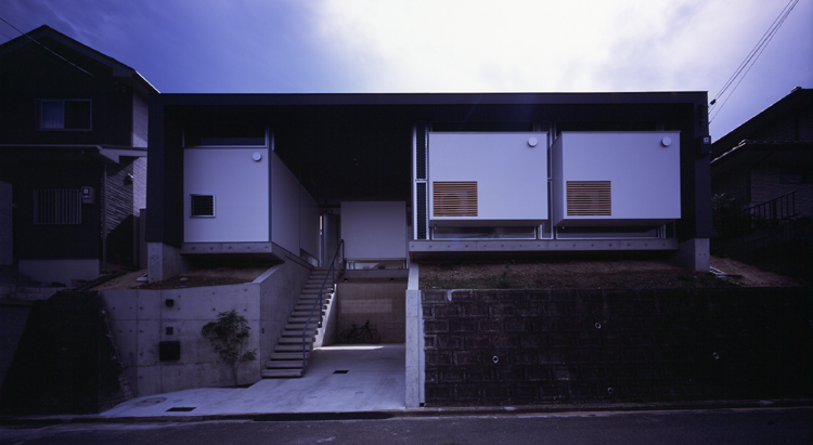 鉄骨造の平屋(+地下)の住宅。敷地より前面道路が3.5M低いため、地下を掘抜き、