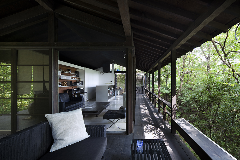 パブリック棟からはガラス越しに雑木が一望でき、プライベート棟からは小窓と天窓に切り取られた枝葉が見える。二つの棟を移動するガラス張りの渡り廊下や 吹きさらしのブリッジからは奥行きのある雑木越しに遠くの山並みや街並みが見える。開放性と閉鎖性を併せ持った住宅。
