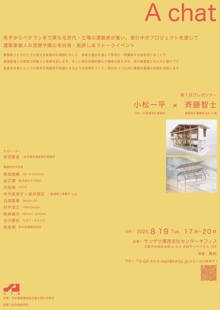 そこに宿る背景的関心や建築の捉え方を、他の建築家たちと共に掘り下げ 発表者自身にとっても思考の再確認や転機となるような時間をつくり、開かれつつも深い建築的議論の空間を目指します。