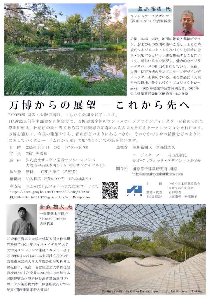 EXPO2025 関西・大阪万博は、まもなく会期を終了します。 JIA近畿支部住宅部会9月例会では、万博会場全体のランドスケープデザインディレクターを務められた 忽那裕樹氏、休憩所の設計者である若手建築家の新森雄大氏の2人を迎えトークセッションを行います。 万博を通じて、今後の建築やまち、都市がどのようにあるべきか、そのなかで自身の活動をどのように 展開していくのか- 「これから先」の展望についての話を伺います。